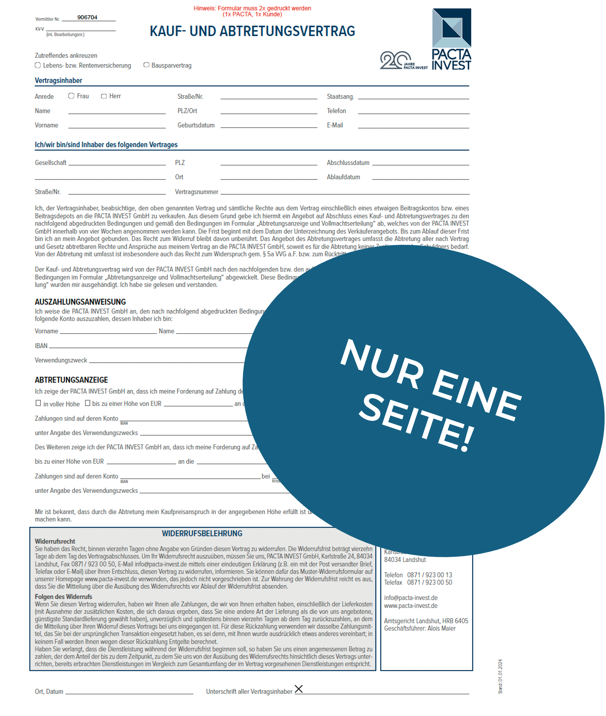 Vollständig ausgefüllter Kaufvertrag mit Abtretungsanzeige im Original